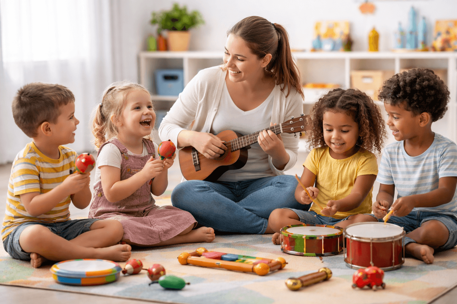 Zajęcia muzyczne to przestrzeń, w której dzieci rozwijają się poprzez ruch, dźwięk i zabawę. W bezpiecznej i wspierającej atmosferze łączymy muzykę z pracą nad emocjami, relacją i wyrażaniem siebie. Podczas zajęć dzieci śpiewają, poruszają się przy muzyce, grają na prostych instrumentach i uczą się współdziałania w grupie. Wspieramy rozwój wyobraźni, koordynacji oraz umiejętności komunikacji.